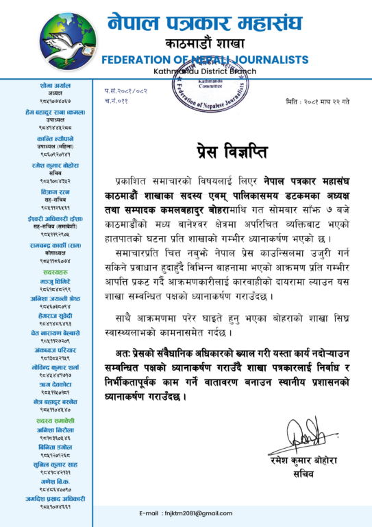 अतः प्रेसको संवैधानिक अधिकारको ख्याल गरी यस्ता कार्य नदोर्‍याउन सम्बन्धित पक्षको ध्यानाकर्षण गराउँदै शाखा पत्रकारलाई निर्वाध र निर्भीकतापूर्वक काम गर्ने वातावरण बनाउन स्थानीय प्रशासनको ध्यानाकर्षण गराउँदछ ।