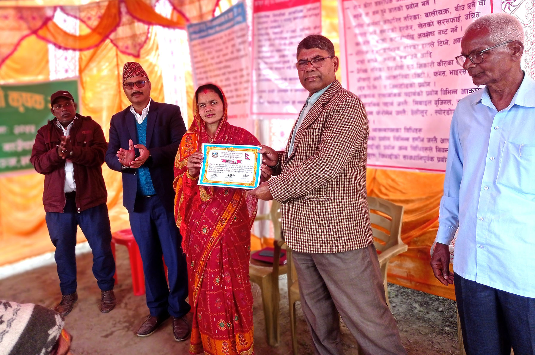 पाठशालामा सहभागी किसानलाई देवानगञ्ज गाउँपालिकाले प्रमाणपत्र वितरण गर्यो