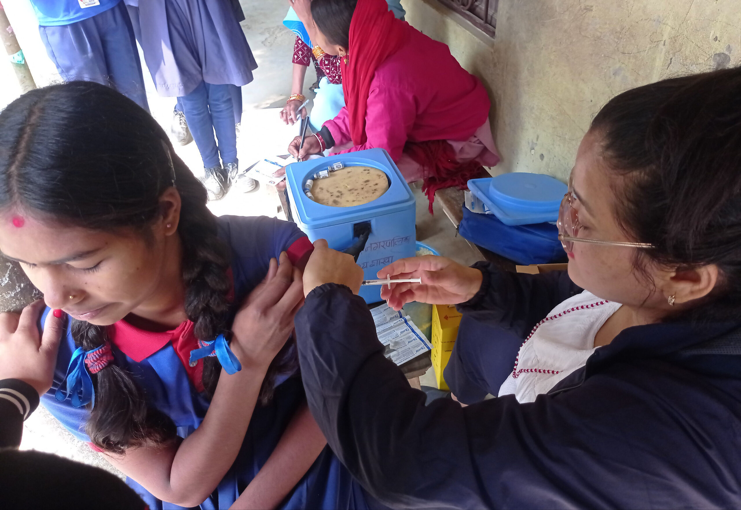 सुनसरीको इनरुवा नगरपालिका–८ स्थित हरिकूल एकेडेमीमा बिहीबार विद्यार्थीलाई पाठेघरको मुखको क्यान्सरविरुद्धको एचपिभी खोप लगाउँदै स्वास्थ्यकर्मी । कक्षा ६ देखि १० सम्मका छात्रा एवं विद्यालय नजाने १० देखि १४ वर्ष उमेर समूहका किशोरीलाई लक्षित गरी माघ २२ गतेदेखि फागुन ६ गतेसम्म देशभर एचपिभी खोप अभियान जारी छ ।