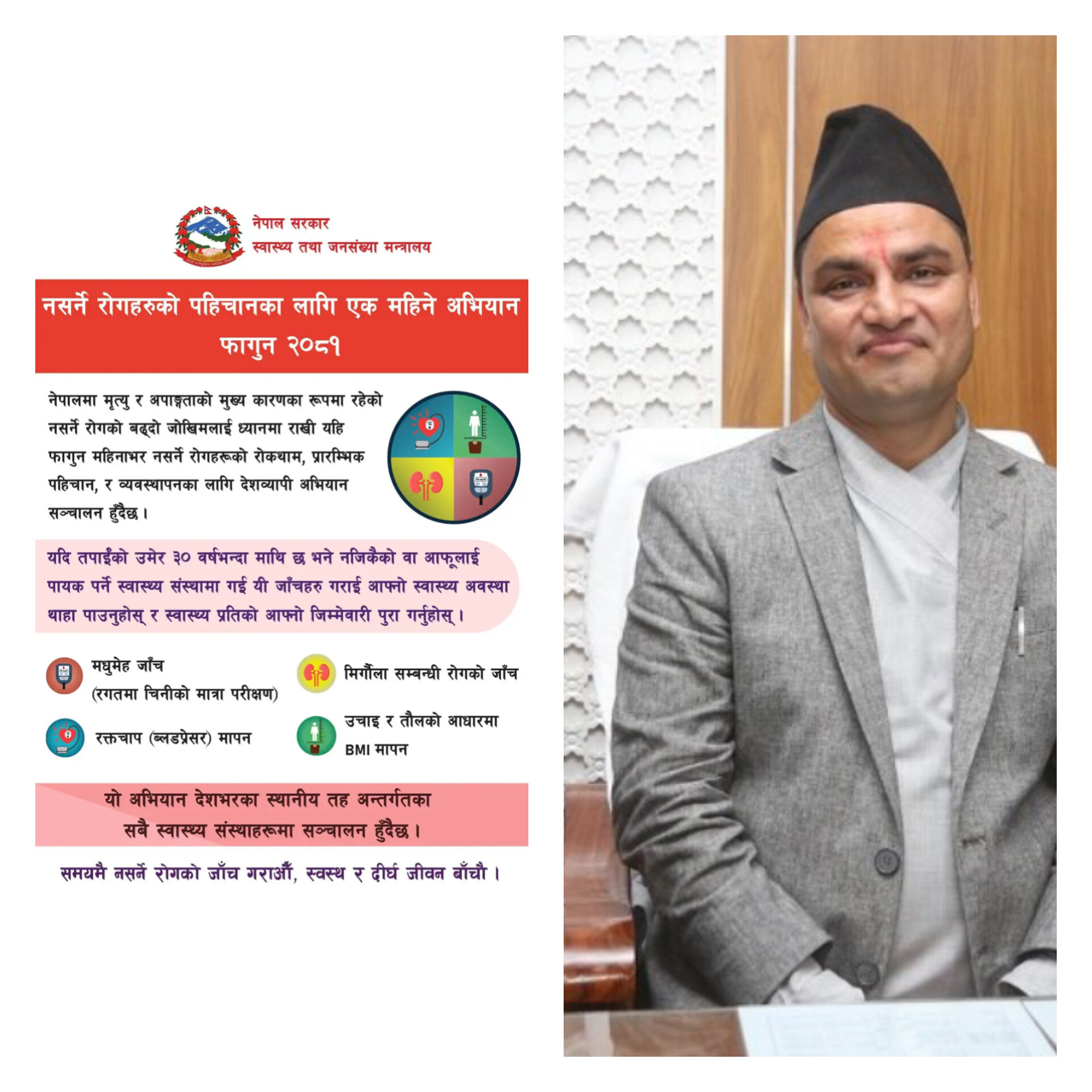मन्त्री पौडेलले यसैलाई ध्यानमा राखेर स्वास्थ्य मन्त्रालयले फागुन महिनालाई नसर्ने रोगहरूको पहिचान अभियानका रुपमा सञ्चालन गर्ने निर्णय गरेको छ ।
