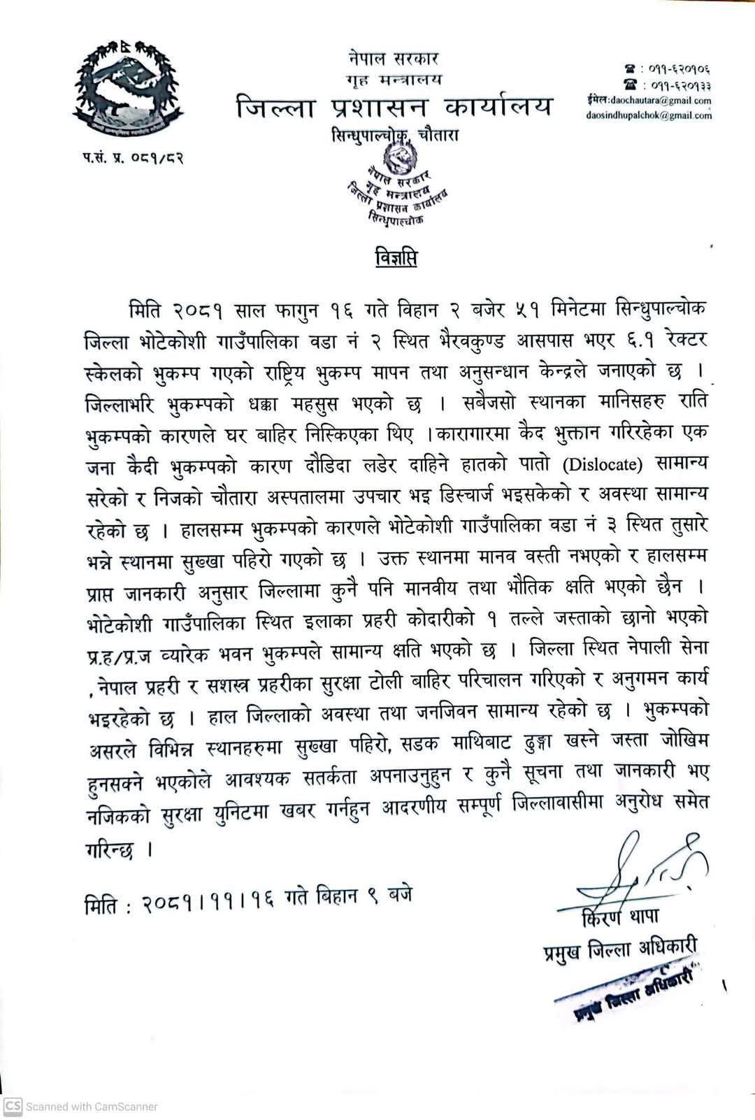भूकम्पबाट भएकाे सम्भावित क्षातिकाे अवस्था अवलाेकन गर्न सुरक्षाकर्मीलाई अनुगमनमा पठाइएकाे पनि विज्ञप्तिमा उल्लेख छ ।