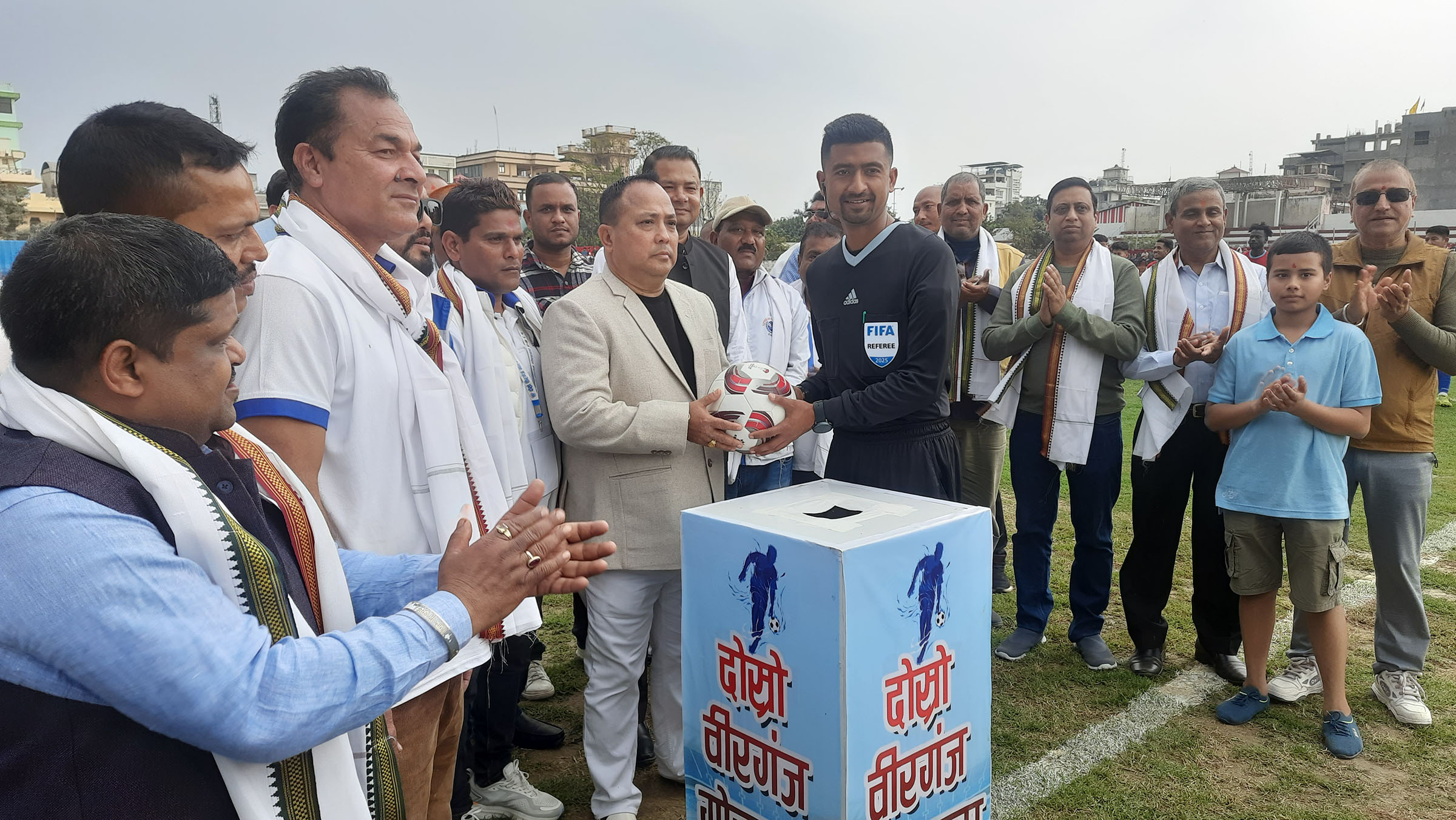 काठमाडौं । मधेस प्रदेशकै सर्वाधिक धनराशिको वीरगन्ज गोल्डकप फुटबलको दोस्रो संस्करण शनिबार वीरगञ्ज महानगरका प्रमुख राजेशमान सिंहले फिफा रेफ्री उमेश विदालाई फुटबल हस्तान्तरण गरी उद्घाटन गर्दै ।