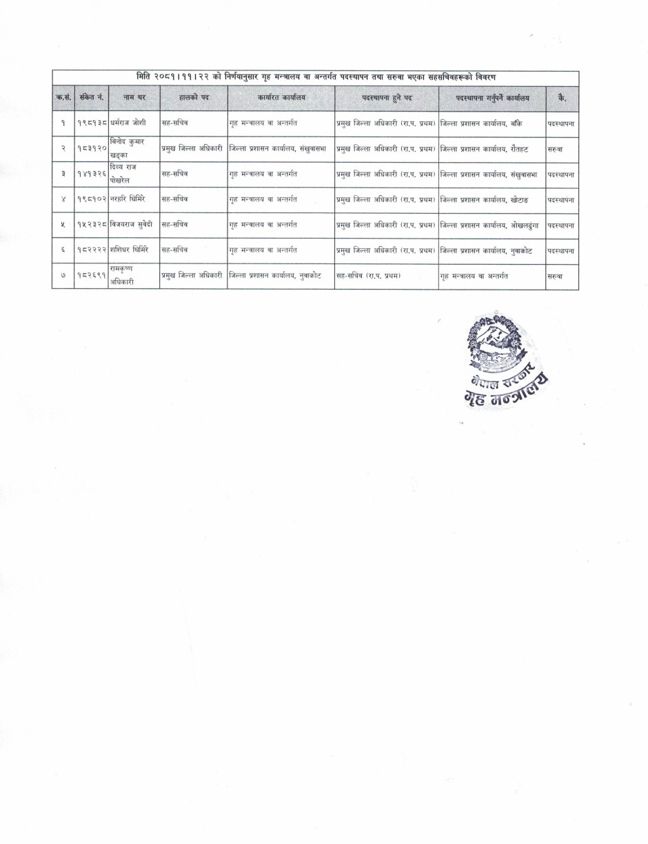 त्यस्तै नुवाकोटका प्रमुख जिल्ला अधिकारी रहेका रामकृष्ण अधिकारी गृह मन्त्रालयमा तानिएका छन् ।