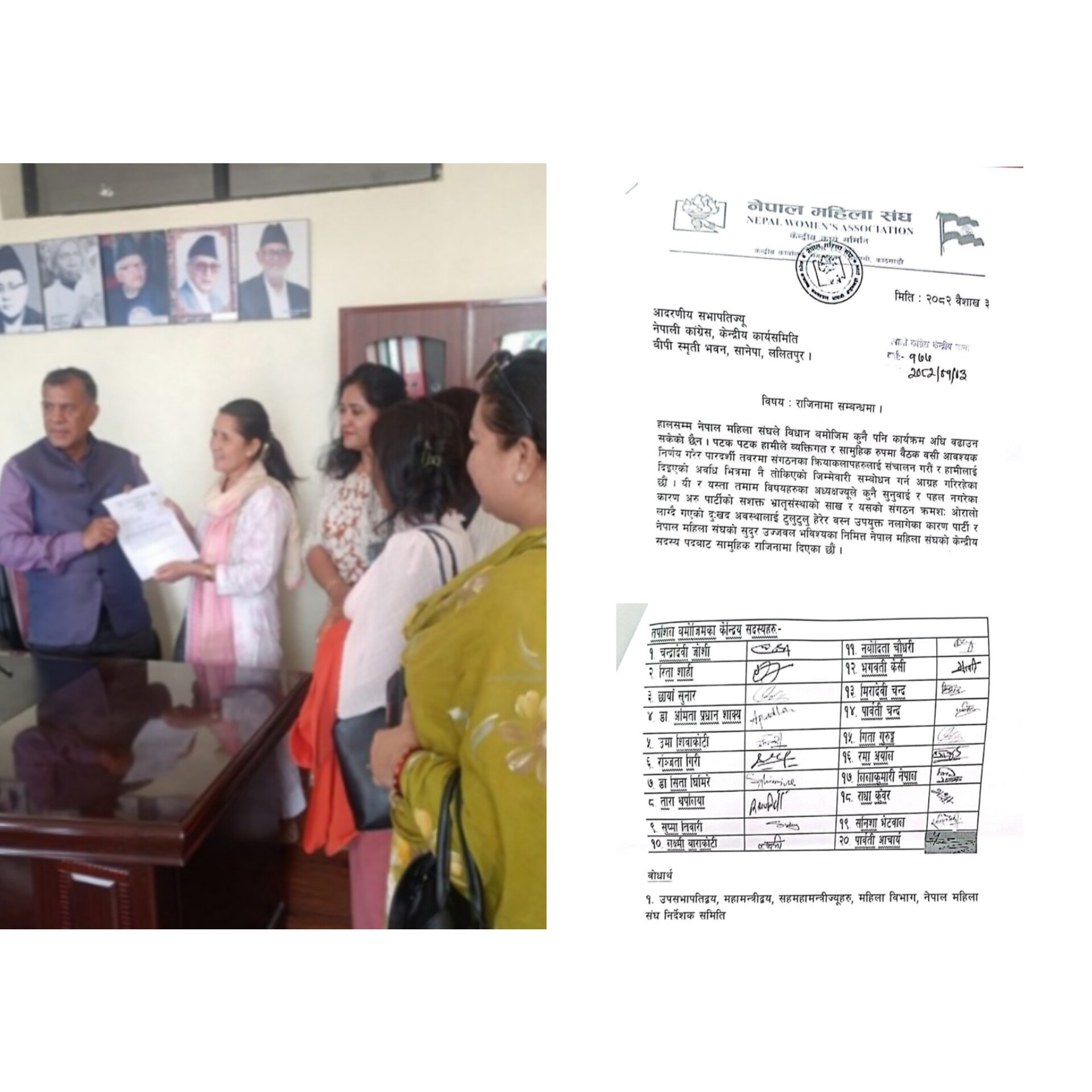 राजीनामा दिनेहरू शेखर–गगन पक्षका हुन् । राजीनामा दिनेहरुमा चन्द्रादेवी जोशी, रिता शाही, छायाँ सुनार, डा.अमिता प्रधान शाक्य, उमा शिवाकोटी, रञ्जिता गिरी, डा.सिता घिमिरे, तारा थपलिया, नवोदिता चौधरी, भगवती केसी, मिरादेवी चन्द, पार्वती चन्द, गीता गुरुङ, रमा अर्याल, लिलाकुमारी नेपाल, राधा कुँवर, सुनिशा भेटवाल र पार्वती आचार्यलगायत छन् ।