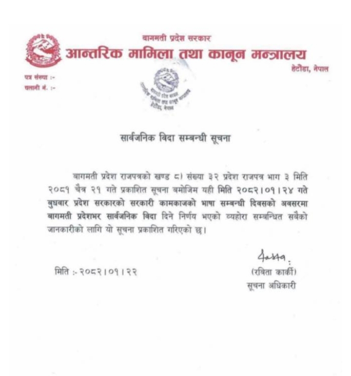 मन्त्रालयले गएको सोमबार नै सूचना निकालेर भाषा दिवसको अवसरमा सार्वजनिक बिदा दिएको जानकारी गराएको थियो।