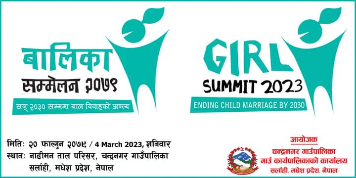 काठमाडौं । सर्लाही चन्द्रनगर गाउँपालिकाकोे फाल्गुन २० गते नाढीमन ताल परिसरमा बालिका सम्मेलन २०७९ आयोजना हुने भएको छ । गाउँपालिकाले सन् २०३० सम्ममा बाल विवाहको अन्त्यका लागि राष्ट्रिय स्तरको बालिका सम्मेलन २०७९ आयोजना गर्न लागेको हो । चन्द्रनगर गाउँपालिकाको आयोजानमा संचालित राष्ट्रिय स्तरको बालिका सम्मेलनमा सहभागी हुने र सहकार्य गर्न इच्छुक संस्था र व्यक्तिलाई सम्पर्क…