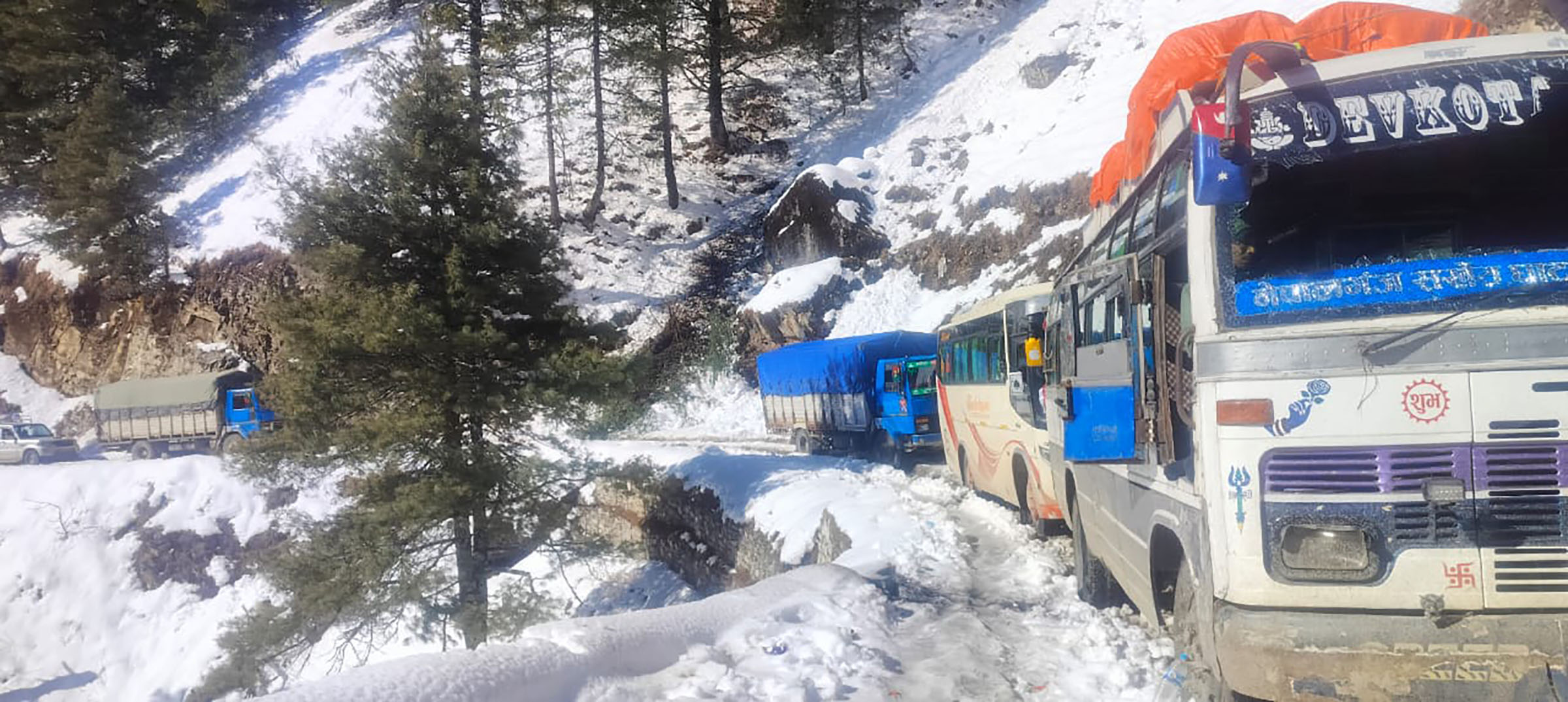 काठमाडौं । गत बिहीबार हिमपात हुँदा सडक अवरुद्ध भएपछि कर्णाली राजमार्ग अन्तर्गत बुलबुले–सातमोड खण्डमा रोकिएका यात्रुबाहक तथा मालबाहक गाडीहरु । सडकमा कहिँ पहिरो त कहिँ बाक्लो हिउँ जमेकाले यातायात अवरुद्ध भएको हो । तस्बिरः नृपेन्द्र बहादुर मल्ल /रासस