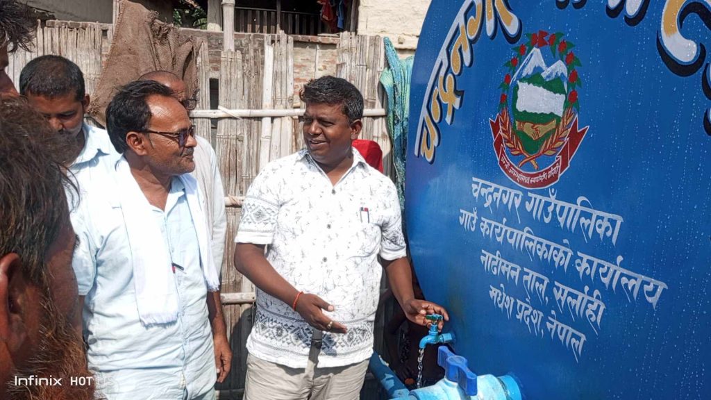 सर्लाही । सर्लाहीको चन्द्रनगर गाउँपालिका अध्यक्ष राजकुमार महतोले चन्द्रनगरवासीमा पानीको समस्या कम गर्न शुद्ध खानेपानी दिनहु वितरण गर्न सुरु गरेका छन् । अध्यक्ष महतोले विभिन्न ठाउँको पालिकाहरुमा पानीको स्रोत सुकेपछी र शुद्ध पिउने पानीको हाहाकार भएपछि वितरण गर्न शुरु गरेका हुन् । त्यस्तै, सर्लाहीको चन्द्रनगर गाउँपालिका, लालबन्दी नगरपालिका, ईश्वरपुर नगरपालिका, कविलासी नगरपालिका, मलंगवा नगरपालिका लगायत…