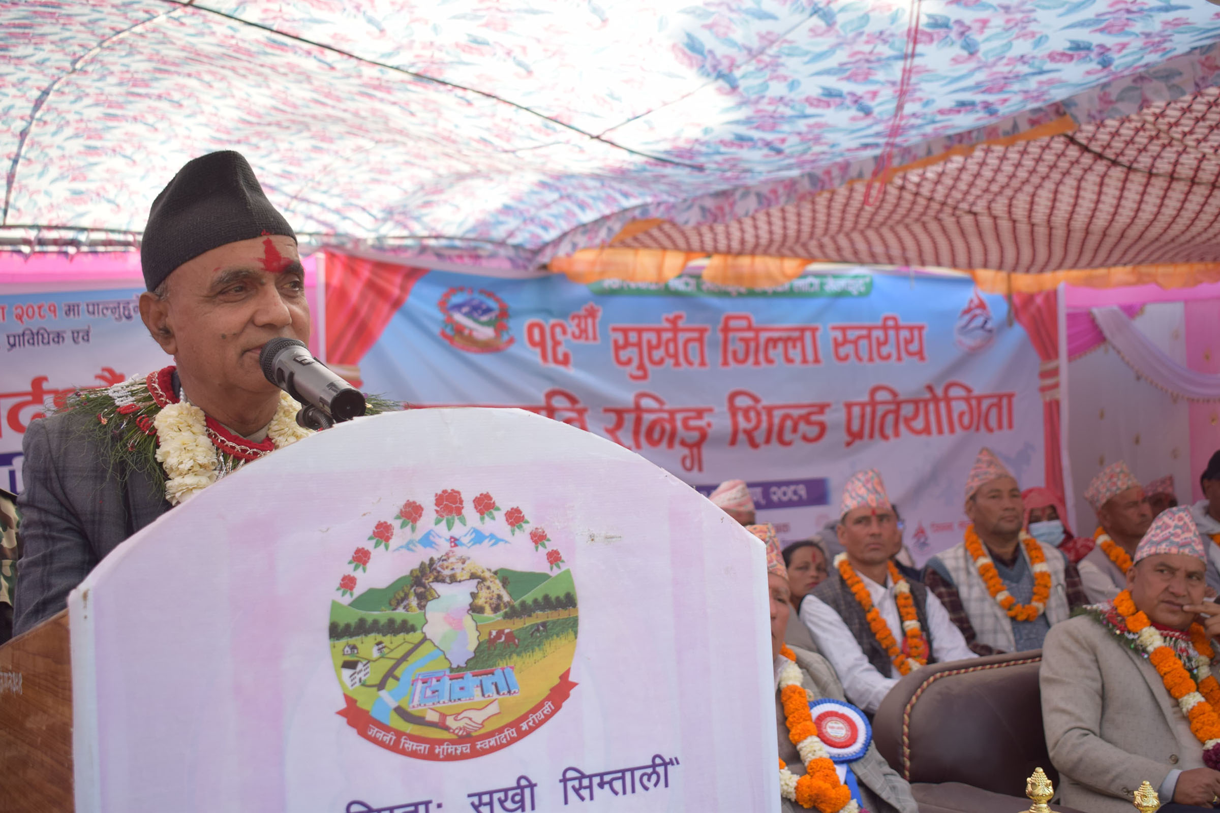 आजको तस्वीर काठमाडौं । सिम्ता गाउँपालिकाद्वारा जामुने बजारमा आयोजना गरिएको १६औँ सुर्खेत जिल्ला स्तरीय राष्ट्रपति रनिङ शिल्ड प्रतियोगिताको शुक्रबार उद्घाटन समारोहमा मन्तव्य राख्नुहुँदै कर्णाली प्रदेशका मुख्यमन्त्री यामलाल कँडेल। तस्बिरः सुरेश आचार्य÷रासस