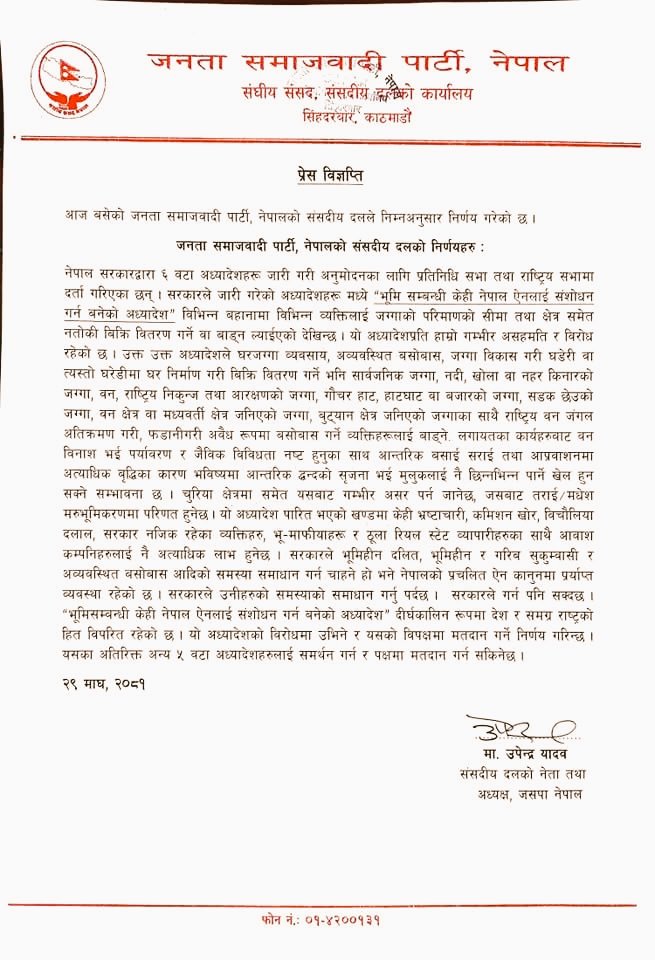 काठमाडौं । जनता समाजवादी पार्टी नेपाल (जसपा) सरकारले ल्याएको भुमी सम्बन्धि अध्यादेशको विपक्षमा उभिने भएको छ । केपी ओली नेतृत्वको सरकारले ल्याएका ६ वटा अध्यादेशमध्ये ५ अध्यादेशमा सकारात्मक देखिए पनि जसपा नेपाल भूमिसम्बन्धी अध्यादेशका बारेमा भने सुरू देखी नै फरक मत राख्दै आएको थियो । मंगलबार बसेको जसपा संसदीय दलको बैठकले सो अध्यादेशको विपक्षमा मतदान…